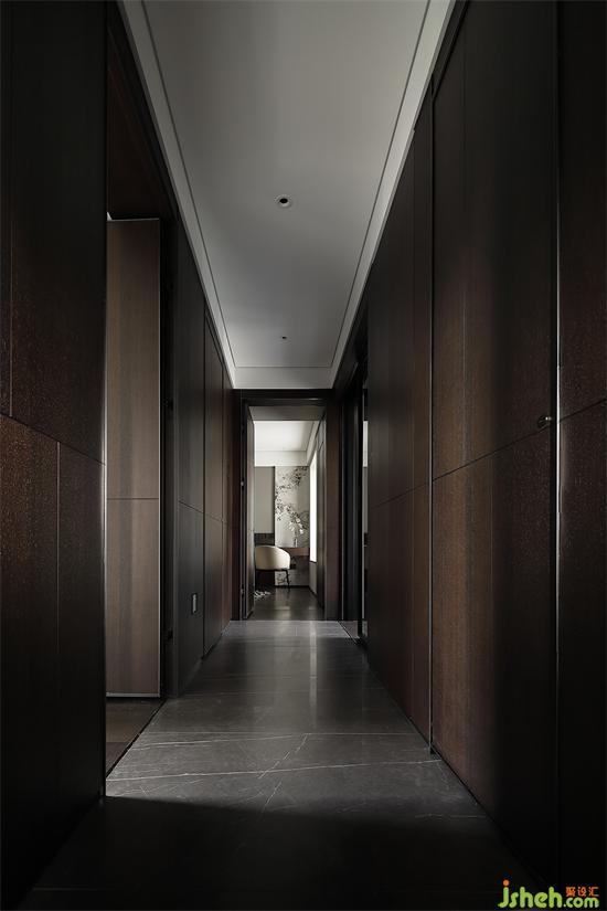 狹長的走道也是本案戶型的一大弊端,我們能做的是優(yōu)化走廊外觀,讓每日必經(jīng)之路充滿儀式感。家裝設(shè)計對于狹長的空間,整潔統(tǒng)一是必殺技,木飾面上墻讓各個入口全部隱形,視覺美觀統(tǒng)一,盡頭的主臥更加隱蔽幽靜,體驗感極佳。