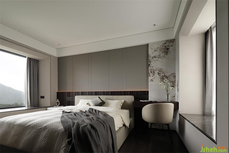 主臥位于走廊盡頭,雙面臨窗南北通透,坐擁絕美山景,明媚的日光雙邊傾涌而下,家裝設(shè)計超治愈的高品質(zhì)睡眠空間。