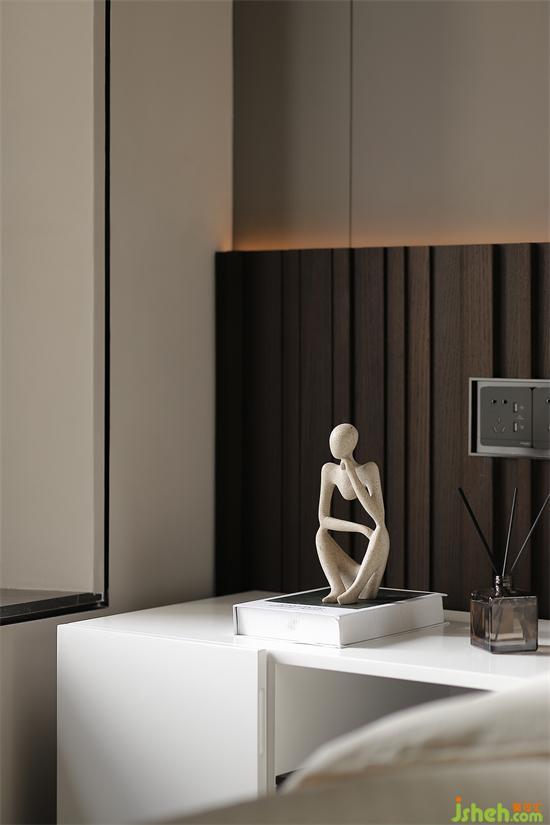淺灰硬包搭配半墻格柵板,側(cè)邊以秀美巖板裝飾,共創(chuàng)內(nèi)斂高級(jí)感床頭空間。窗邊角落打造懸空臺(tái)面,床頭梳妝一角順應(yīng)而生,美觀便捷。