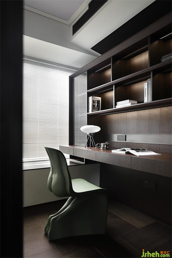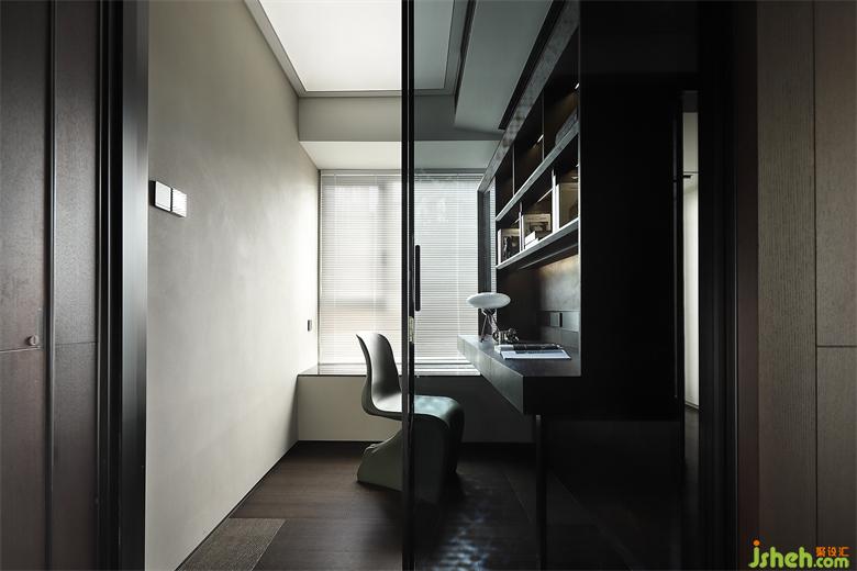 書房被外衛(wèi)借用了部分區(qū)域,剩下的部分雖小卻也夠用,獨(dú)立空間安靜舒適,玻璃推拉門隔斷,灰黑色與整體更加協(xié)調(diào)統(tǒng)一,家裝設(shè)計(jì)且不會(huì)影響走廊采光。