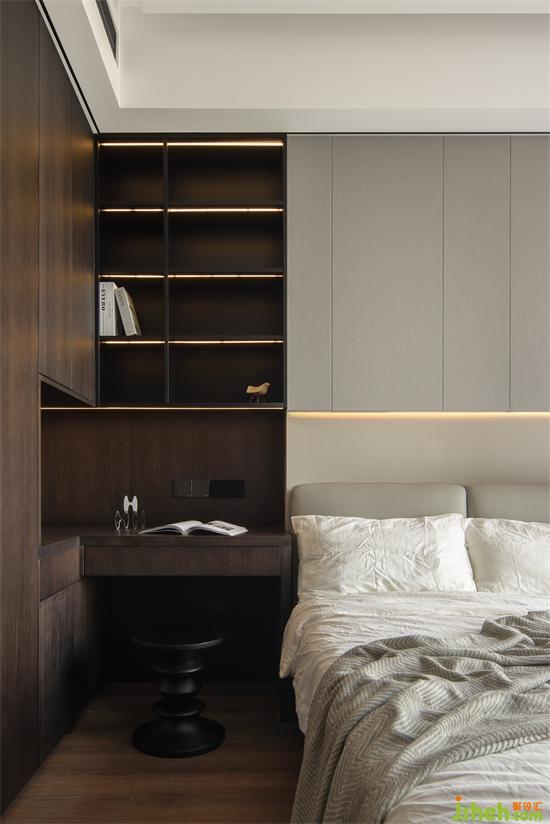 從衣柜中延伸出床頭柜區(qū)域,家裝設(shè)計(jì)還能充當(dāng)小書桌與梳妝臺(tái)使用,小空間實(shí)現(xiàn)大功能,層層開放格搭配燈帶,書柜功能區(qū)也是臥室氛圍感來源。