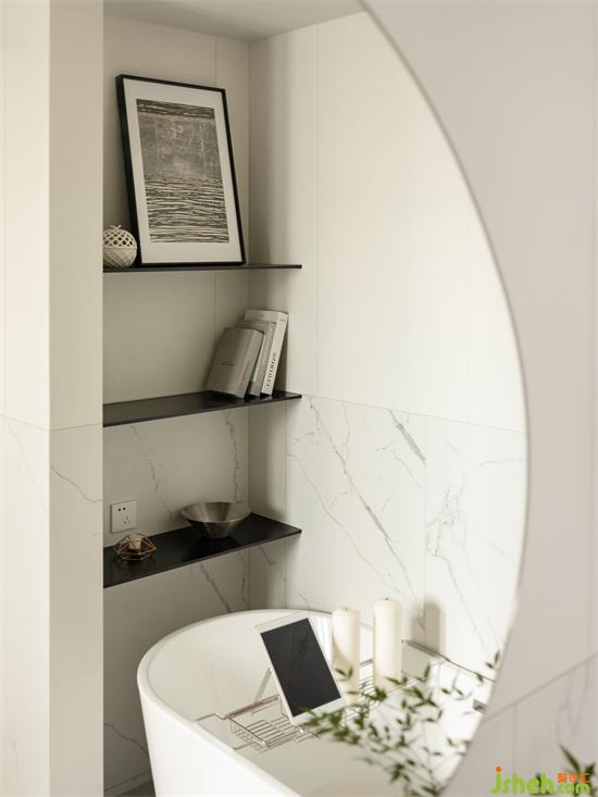 浴缸角落打造三層輕薄擱板,黑色鐵藝材質(zhì)簡(jiǎn)約時(shí)尚,烘托情調(diào)滿(mǎn)滿(mǎn)的泡澡氛圍,收納方式妙而不俗,完美隱匿且不失質(zhì)感,家裝設(shè)計(jì)將功能性從細(xì)節(jié)上優(yōu)化,共造出彩的家居生活場(chǎng)景。