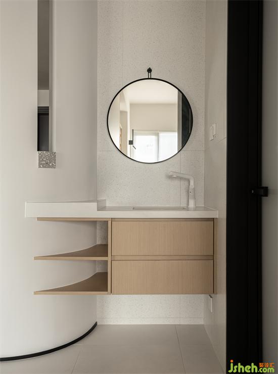 弧形凹面背后隱藏干區(qū)洗漱臺(tái),無(wú)論是飯前洗手,還是日常洗水果等等事宜,都無(wú)比方便。家裝設(shè)計(jì)不浪費(fèi)一絲一毫的空間,弧面處由木工現(xiàn)場(chǎng)制作的浴室柜過(guò)渡,視覺(jué)上延伸洗漱臺(tái)面積,且豐富了儲(chǔ)物功能。