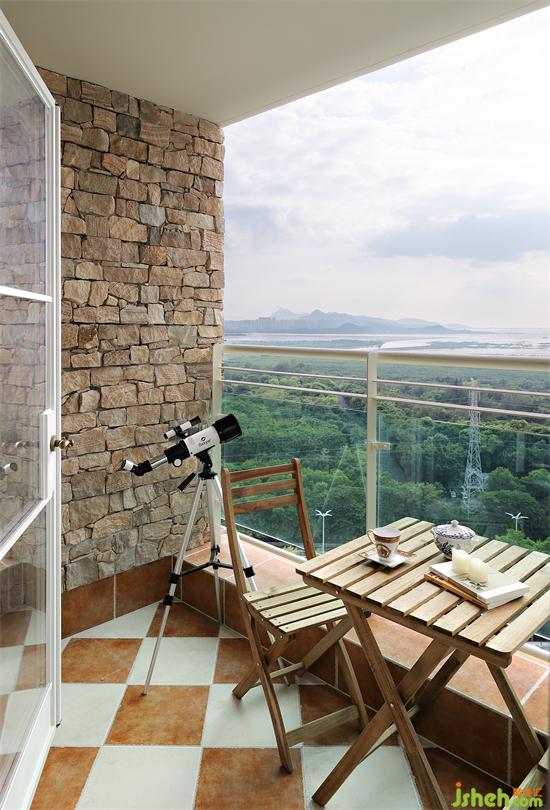陽臺地面用拼接復(fù)古磚鋪貼,玻璃門以及欄桿統(tǒng)一采用米白色邊框,墻面采用石材打造原始質(zhì)感,搭配自然原木小桌椅,與窗外的森林海洋融合,盡顯粗獷原始美學(xué),擁抱大自然讓身心放松。