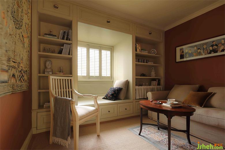 飄窗的設(shè)計(jì)是整個(gè)書(shū)房的亮點(diǎn),原本突兀的飄窗在英式風(fēng)里稍顯違和,我們?cè)O(shè)計(jì)成書(shū)柜+卡座的形式,深圳金地翠堤灣家裝設(shè)計(jì)打造成一個(gè)閱讀角,氛圍瞬間輕松愜意,窗戶也特意改成百葉窗,彰顯英倫風(fēng)格的獨(dú)特復(fù)古感。