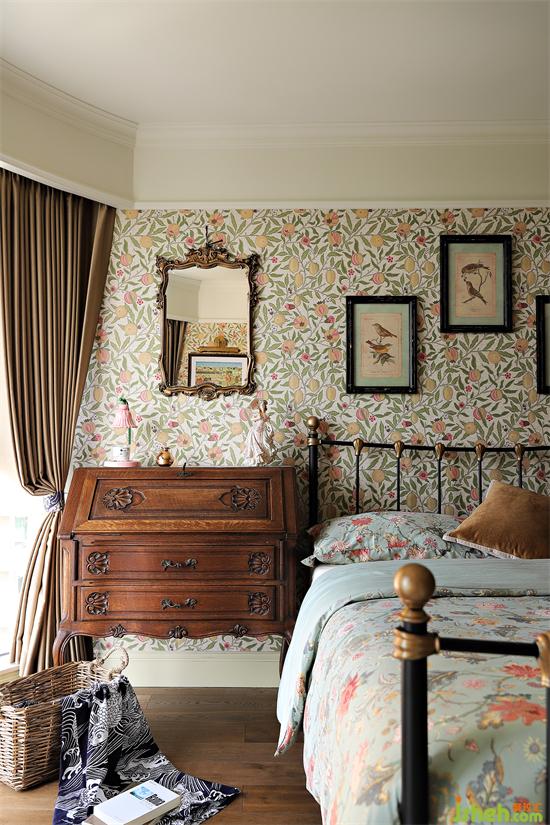 整個(gè)臥室以花卉為主題,壁紙以及床品我們選用英國(guó)本土品牌William Morris,深圳金地翠堤灣家裝設(shè)計(jì)讓碎花的復(fù)古感縈繞臥室,從陳設(shè)到每一件家具,將英倫感武裝到牙齒。