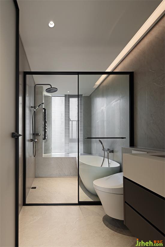 與客廳一致的灰調(diào)瓷磚通鋪衛(wèi)生間墻面和地面,極窄黑框玻璃門隔斷淋浴區(qū),空間寬敞容納浴缸,滿足不同的沐浴需求,提高生活品質(zhì)。