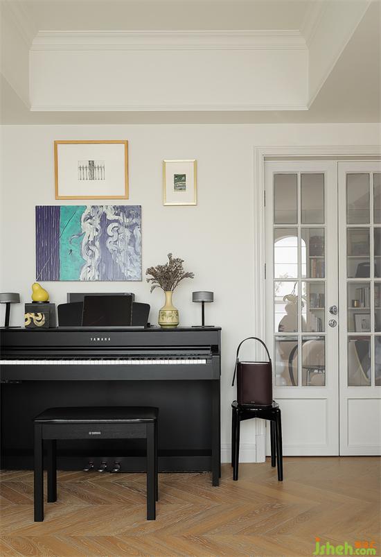 鋼琴擺放在門后角落,上方點(diǎn)綴上裝飾畫,融合進(jìn)整屋格調(diào),完美解決了鋼琴的安放問題,練琴環(huán)境輕松治愈。