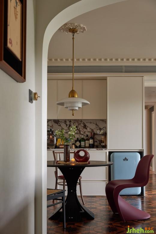 餐廳里,淺色柜體搭配黑色餐桌,在燈光的暈染下展現(xiàn)迷人魅力,帶有復(fù)古圖案和紋理的拼花地板,也為餐廳增添一份復(fù)古的韻味,燭光搖曳,絲絲縷縷地滲透進(jìn)餐廳的每一處。