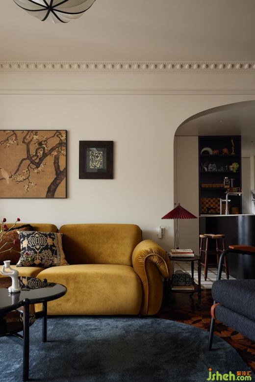 法式與復(fù)古美學(xué)交織演繹,暖色調(diào)下交融出斑駁光影,午后有人斜倚在沙發(fā)上,目光游離在畫與地毯之間,思緒也漸漸飄遠(yuǎn)。