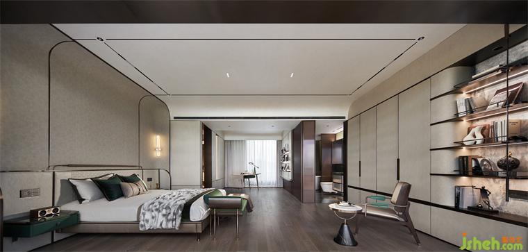 艾未設計以瓦松綠與弧形手法打造寧靜質感的空間墻面,灰度適中,給臥室最放松的環(huán)境。