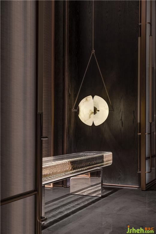 玄關(guān)似一座水晶宮殿,以四面通高的玻璃門,將內(nèi)、外朦朧劃分,渲染秘境之感。每組門的開合轉(zhuǎn)換,可實現(xiàn)不同功能區(qū)的劃分。北京半山別墅設(shè)計圍繞此而設(shè)的隱藏式儲物柜,旨在滿足居者不斷增長的收納需求。金屬網(wǎng)勾勒出旋轉(zhuǎn)而上的樓梯輪廓,令人心向往之。