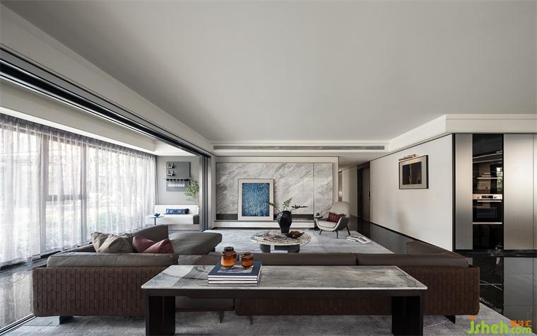 落地窗將繁華與景致盡收眼底,訴說著包容、開放的都市之美??蛷d更是家庭聚會的互動空間,暢通的洄游動線,勾勒大宅的非凡氣度。樣板房設(shè)計以灰調(diào)為基底,在溫潤的木飾面與花紋大理石、金屬等多種材質(zhì)肌理的巧妙碰撞中,極具視覺魅力。