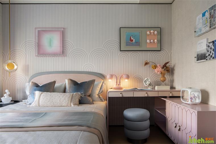 在簡潔幾何形的壁紙鋪就下,加以線性吊燈的點綴,提升了女兒房的整體層次,雖有繽紛色彩,卻多而不繁,溫柔細膩的基調(diào)筑造起公主夢幻般的小天地,自然流淌出的粉嫩與愜意在此輕柔相遇,溫潤了時光。