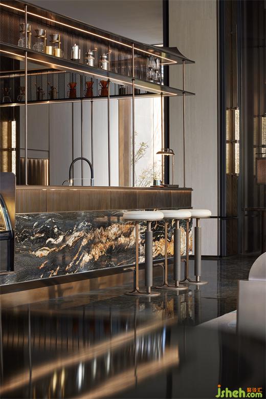 遵循中國古典的步入方式,在空間起承轉(zhuǎn)合之際,往往藏匿著一些不期而遇的驚喜。酒吧區(qū)置身于高聳的屏風(fēng)背后,吧臺呈層疊與托起的姿態(tài),優(yōu)雅的弧形與背景陣列的酒柜格架、韻律分明的吊燈交相輝映,既彰顯層次之美,又和諧一體。黑色的石材與金色的構(gòu)件搭配仿佛置身于蓋茨比時代的雞尾酒吧,展現(xiàn)出浪漫迷人之感。