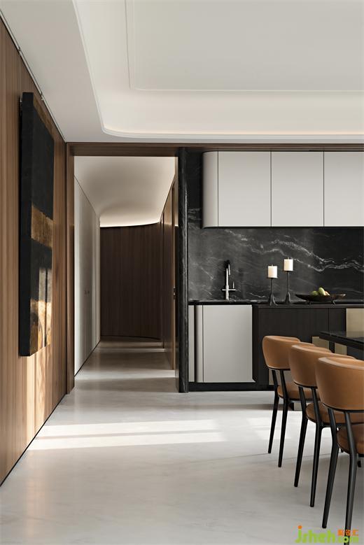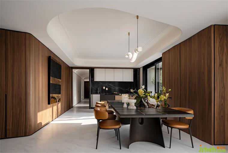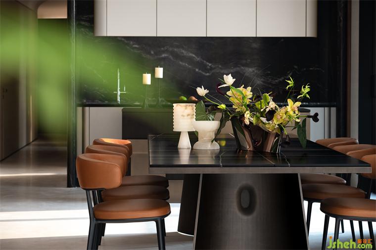 餐廳置有與翠湖入戶大堂同系列的云石吊燈,以一條流暢的曲線引導感知。在某種程度上,這既是從外部到歸家的過渡,又渲染著自由舒緩的狀態(tài)。這也是設計師世亮注重設計語匯的統(tǒng)一和延續(xù)的又一印證。