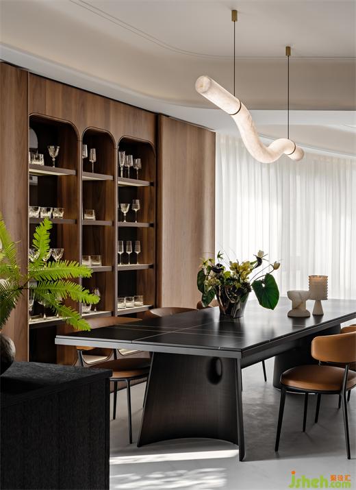 所謂“人養(yǎng)晶、晶養(yǎng)人”,業(yè)主對水晶有著天然的好感與偏愛,擁有數(shù)不清的巴卡拉。大平層設計餐廳的曲面墻因勢化身水晶的展示舞臺,移門開合間,琳瑯滿目的水晶熠熠生輝,極具秩序美感。這些不僅是物質(zhì)性的外在流露,更是情感性的向內(nèi)延伸。