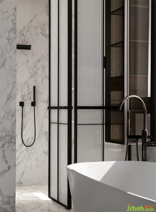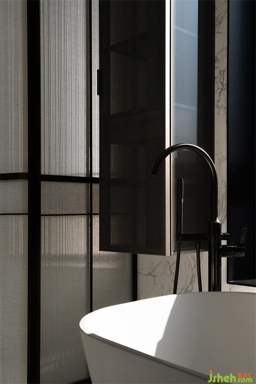 主衛(wèi)借由現(xiàn)代手法,描摹古典之韻,啞光奧巴馬木紋大理石與銅制鏡面在多材質(zhì)的組合混搭碰撞中,格調(diào)頓出。