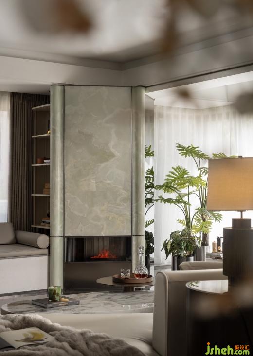 樣板房設(shè)計的細節(jié)之處不在于繁復(fù)的堆砌,而是設(shè)計師的巧思。艾未設(shè)計強調(diào)生活與藝術(shù)的融合,壁爐與客廳背景墻以青玉石鋪就,飄窗與角落書架則是輕松閱讀的有效引導(dǎo),豐盈的綠植也給室內(nèi)帶來了無限生機。