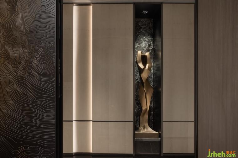 玄關(guān)作為家宅之始,便以溫暖材質(zhì)與柔和燈光相迎。通頂柜體的設(shè)計,暗藏存儲空間,讓出行與歸來皆倍享自在。樣板房設(shè)計輔以嵌入的雕塑藝術(shù),既是端景,又可機動變換為節(jié)日活動主題元素,在方寸之地賦予入戶無限可能。