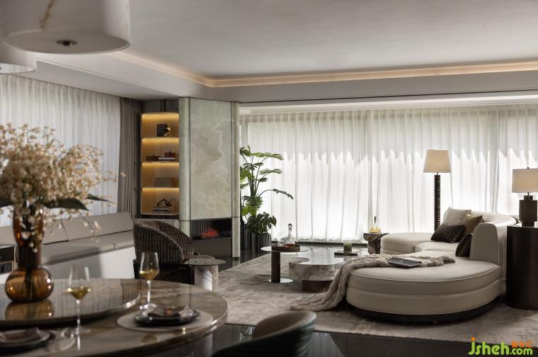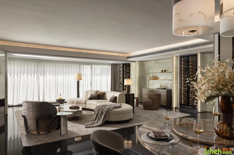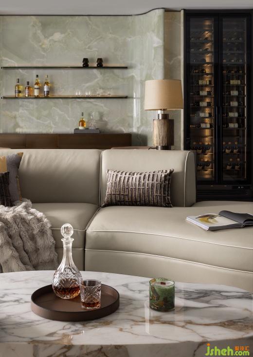 約270°的環(huán)幕視野,讓陽光肆意傾灑,觀景效果極佳。光影勾勒形體,色彩渲染風(fēng)格,以打造能量社交場。視覺的溫暖和青玉石帶來的溫潤質(zhì)地,在淡雅柔軟的飾面映襯下,散發(fā)著慵懶愜意之感。