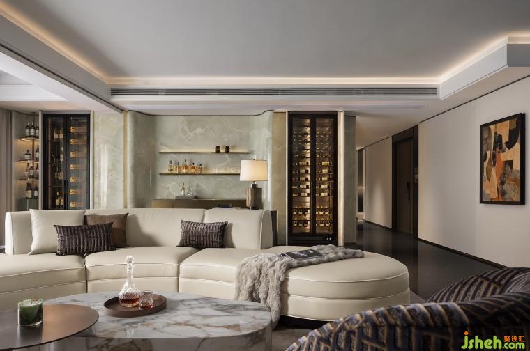 弧形沙發(fā)后的一組休閑椅,旨在實現(xiàn)生活方式及場景需求的變換組合。既是茶臺,亦可是開放的親子空間。同時有效利用墻體和飄窗,定制豐富的藏酒區(qū),以美學(xué)介入未來生活,透露居者品味之余,讓這一隅也擁有著無限延展性。