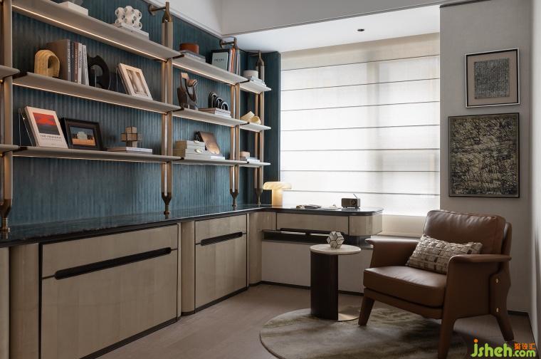 樣板房設(shè)計(jì)集收藏、私享于一體的書房區(qū),摒棄冗雜的裝飾,展示架墻面與特殊木紋墻紙拼接,勾勒出立體層次。同時(shí)利用柜體增設(shè)折疊床,以靈活實(shí)現(xiàn)展開或折疊之態(tài),打造成多功能靈動(dòng)空間。