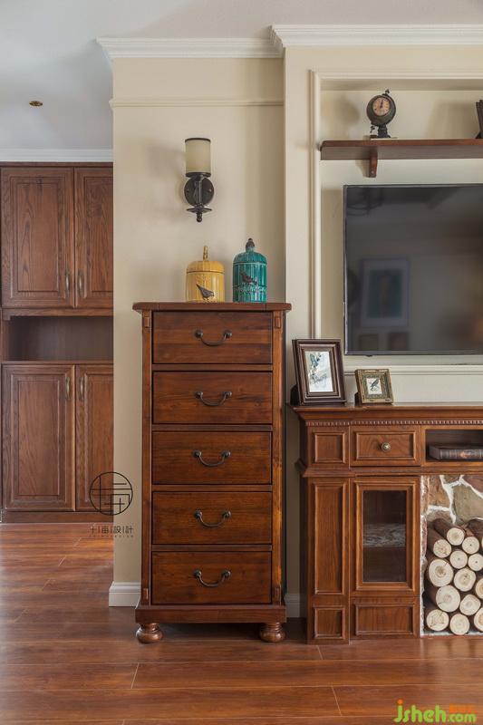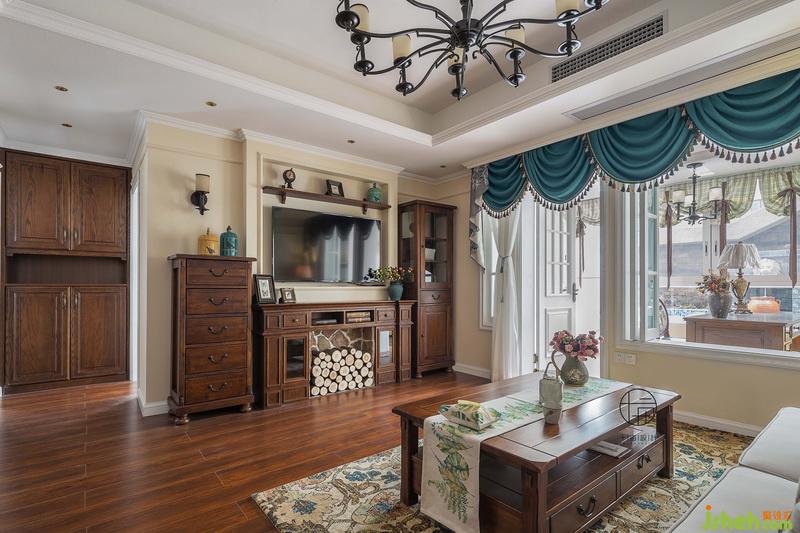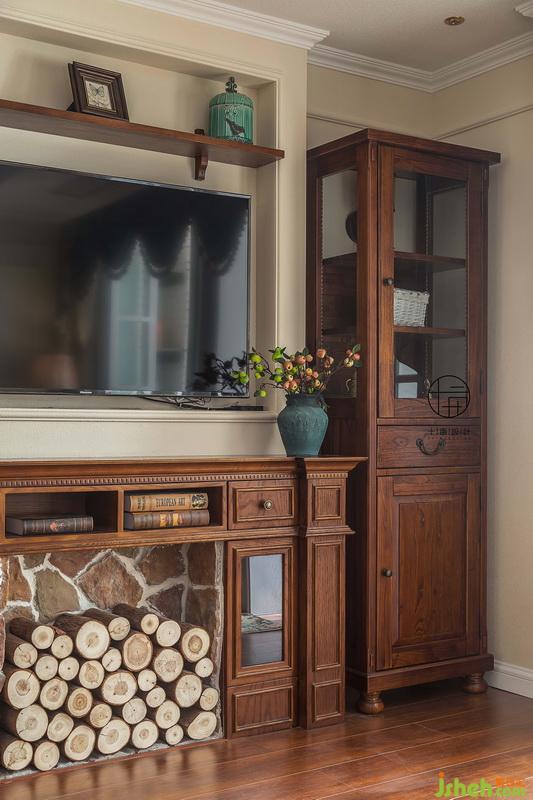 帷幔窗簾提升空間精致度,實(shí)用錯(cuò)落收納柜體,拼出美式電視背景,原木樁增添自然元素