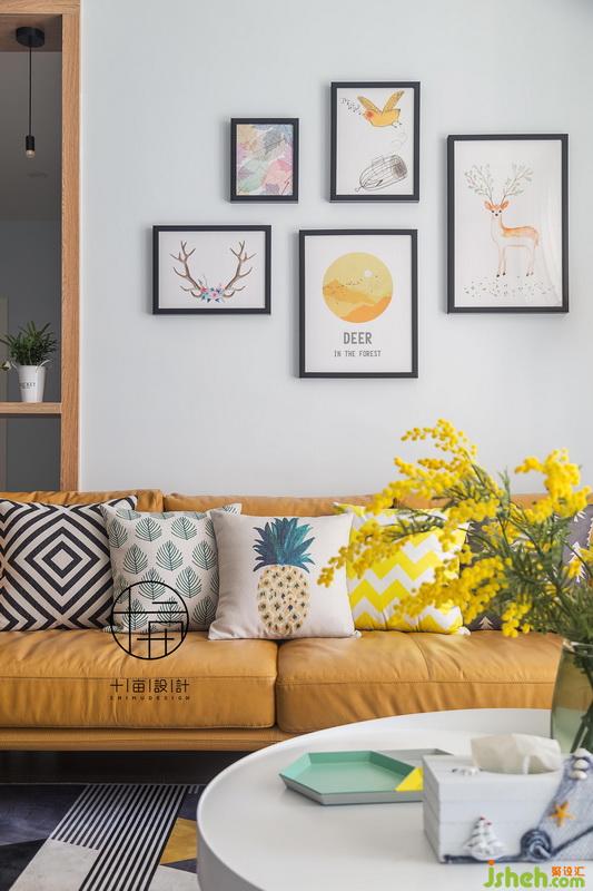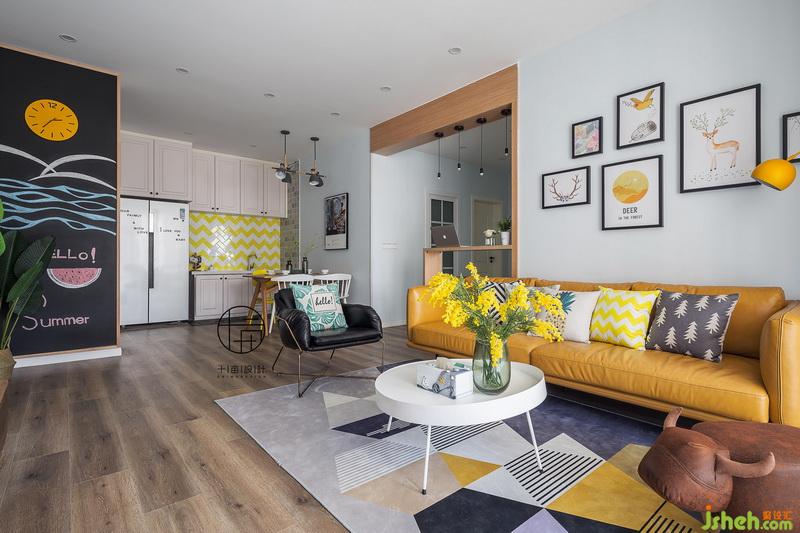 清淺干凈的硬裝搭配跳躍暖色軟裝,公領(lǐng)域空間充滿活力