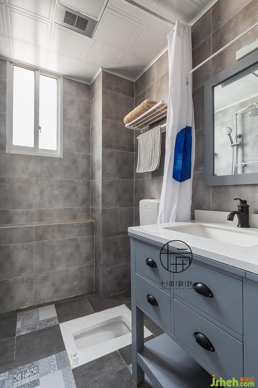 主衛(wèi)灰色搭配局部花磚點綴,藍(lán)灰色成品臺盆柜與整體風(fēng)格完美相搭,小空間蹲坑淋浴空間功能重疊