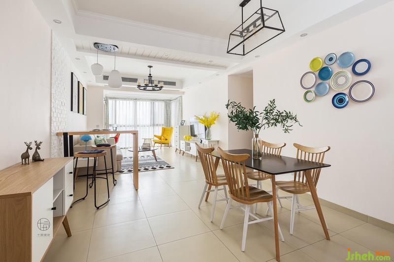 室內(nèi)設(shè)計(jì)師將木質(zhì)餐椅搭配深色桌面,柔和乳膠漆墻面點(diǎn)綴彩盤墻飾,與餐桌綠植提亮空間色彩