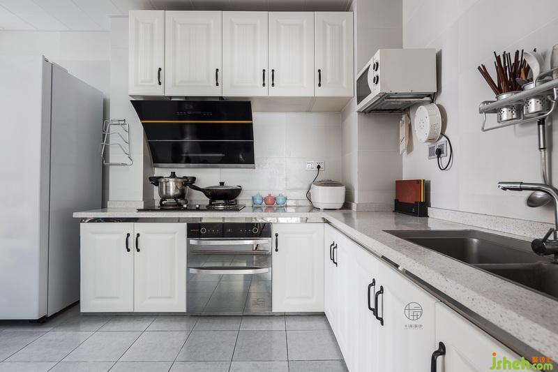 廚房地面通鋪灰色瓷磚,立面淺色瓷磚搭配白色櫥柜,灰色麻點(diǎn)臺面耐臟易打理