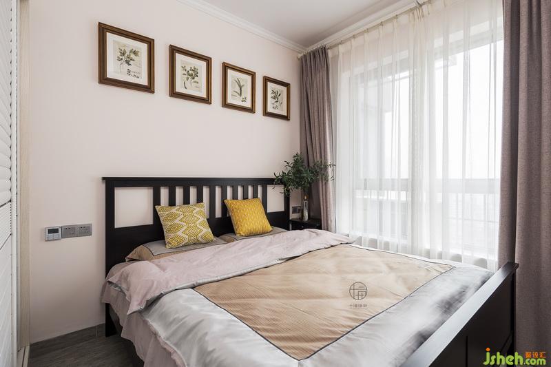 次臥淺粉色乳膠漆墻面,點(diǎn)綴幾幅綠植裝飾畫作床背景,黑色簡約大床與小巧的床頭柜,咖啡色窗簾,空間清雅自然