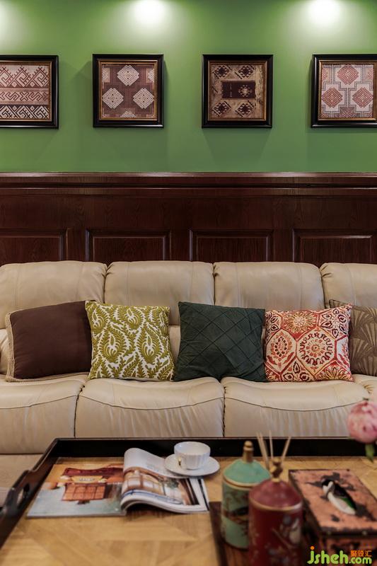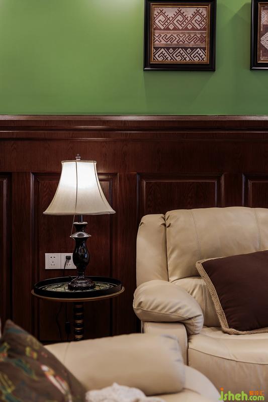 深色半高護墻搭配森林綠調(diào)墻面,卡其色皮質(zhì)沙發(fā)上幾個靠枕風格與掛畫呼應