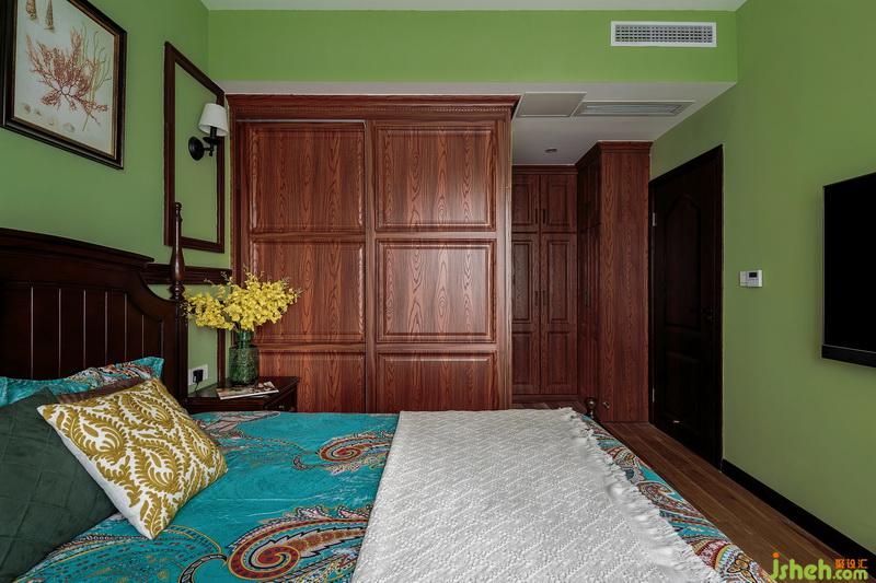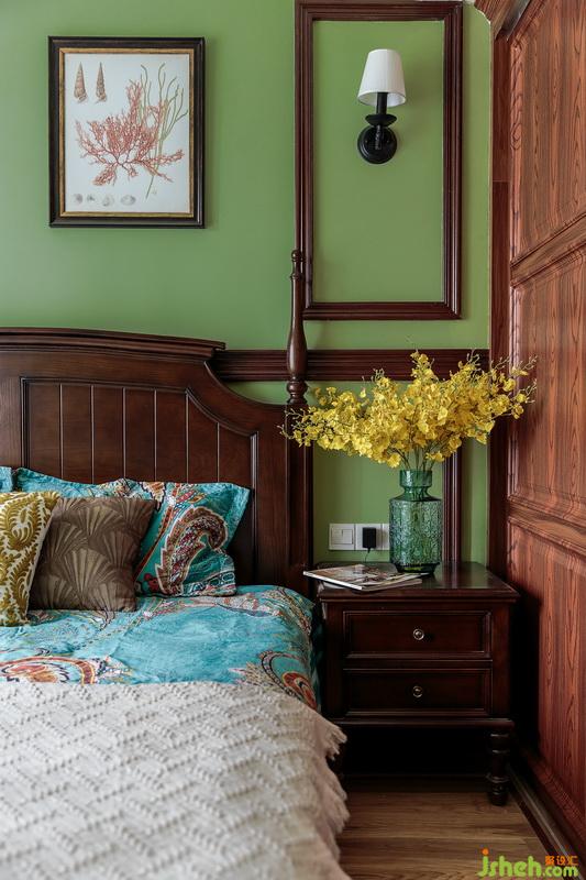 主臥室內(nèi)設計師延續(xù)森林綠的床背景,深木畫框與裝飾畫點綴造型