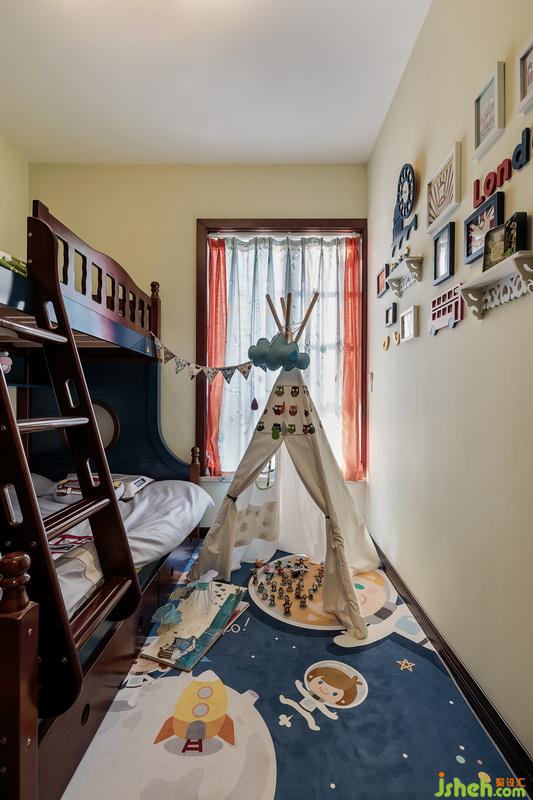 另一個兒童房室內(nèi)設計師采用淺黃色墻面漆,搭配深色實木高低床,點綴充滿童趣的溫馨軟裝