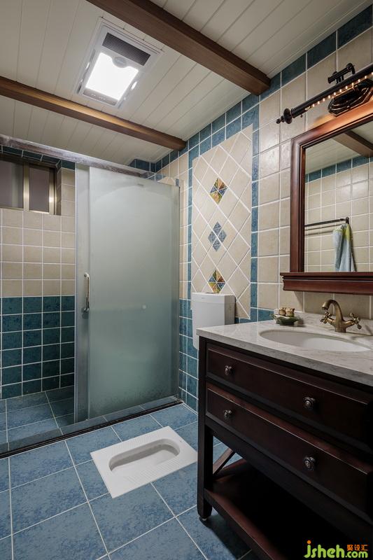 室內(nèi)設(shè)計師采用冷暖復(fù)古磚拼貼墻地面,頂面橫梁設(shè)計與整室風(fēng)格呼應(yīng)
