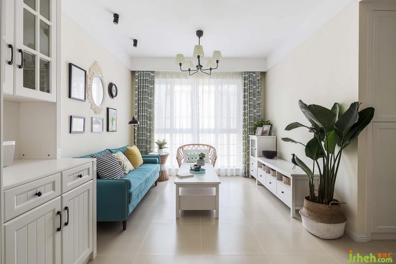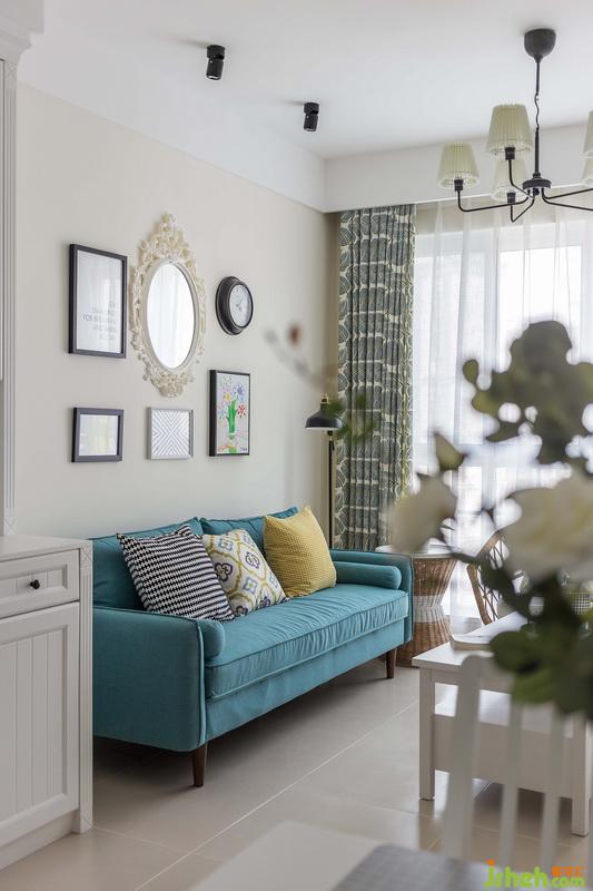 藍色主沙發(fā)點綴跳色靠枕,背景室內設計師采用不同的墻飾與簡框畫裝飾出不對稱的美