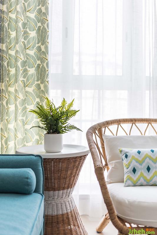 白紗與綠色系葉片圖案窗簾,營造明亮舒適的清新氛圍