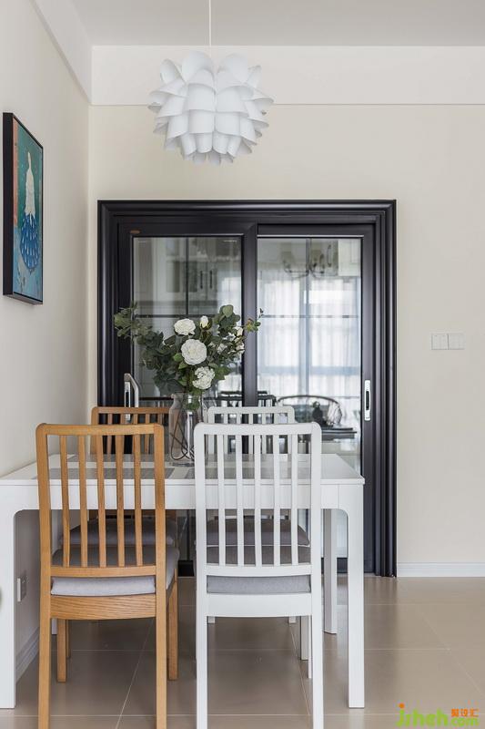 白色與木色餐椅相搭,唯美賦有藝術氣息的軟裝與燈飾點亮餐廳