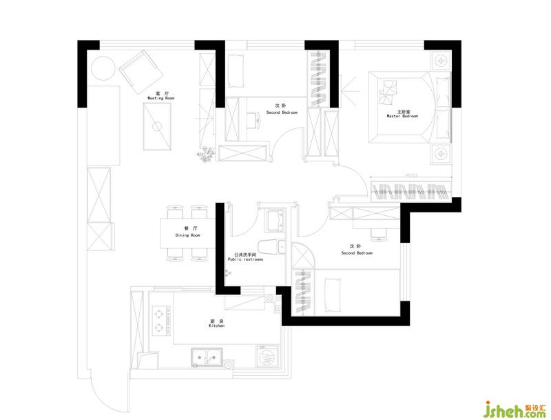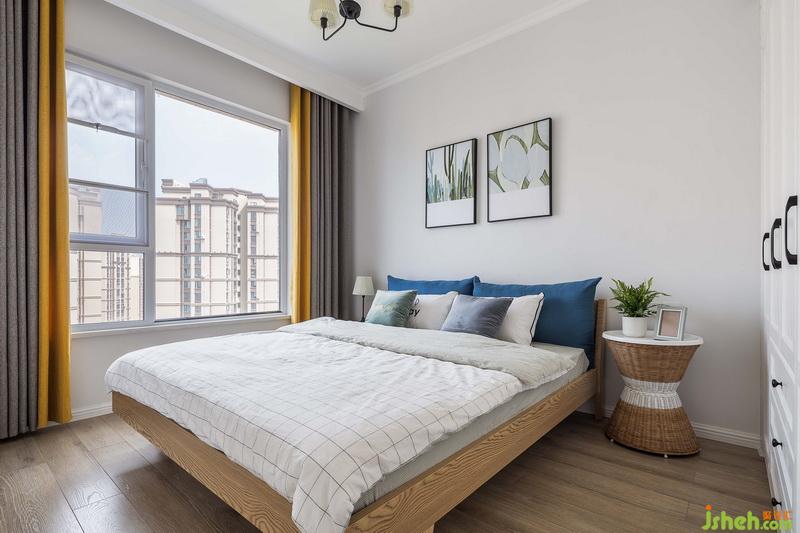 主臥,地面通鋪木地板,淺咖色床背景裝飾兩幅簡(jiǎn)框畫(huà),拼色窗簾提亮空間