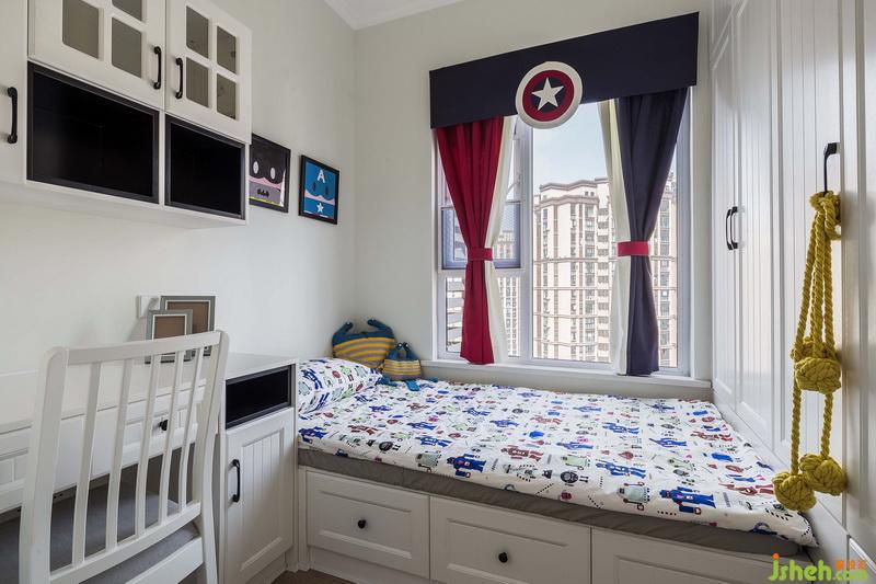 兒童房木作榻榻米連接置頂儲(chǔ)物柜,室內(nèi)設(shè)計(jì)師在書(shū)桌吊柜滿足學(xué)習(xí)休閑機(jī)能,美隊(duì)主題窗簾與機(jī)器人床品迎合男孩喜好