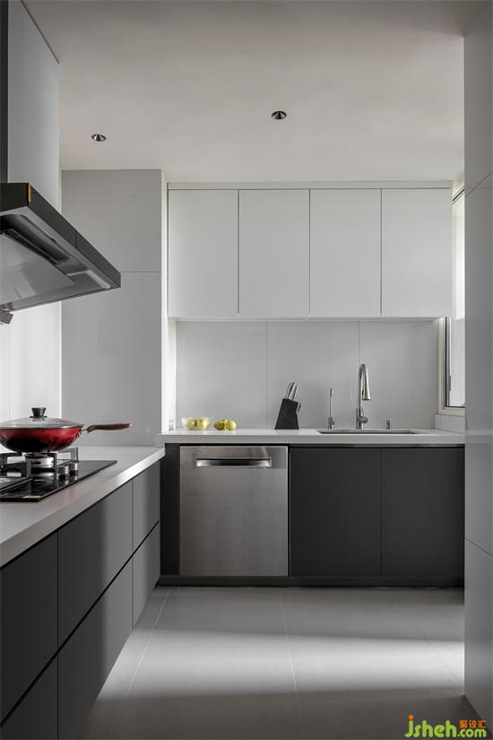 廚房色調(diào)搭配上明暗分明,黑白灰配色延續(xù)經(jīng)典。家裝設(shè)計地柜用黑色,增加厚重感與安全感。吊柜用白色,增加空間明亮度。