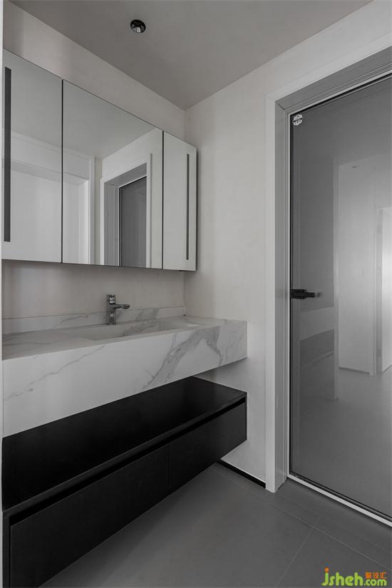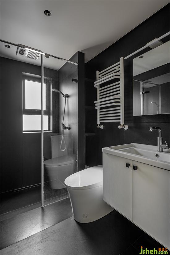 主衛(wèi)采用干濕分區(qū),空間布局更加合理。家裝設(shè)計次衛(wèi)以黑色為主,與全屋而言形成了色彩上的反差。浴室柜與潔具的選擇則是白色,鮮明的色彩對比增加了空間層次感。