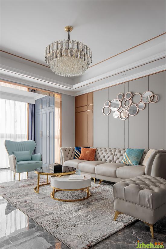 The house is square and broad. The ground and TV wall are made of bright ceramic tiles. Black and white color highlights the strong contrast between light and shade. Classic and noble coexist. The mirror is inlaid in it. It is as clear as water. The light and shadow effect is excellent, greatly improving the sense of spatial level.
