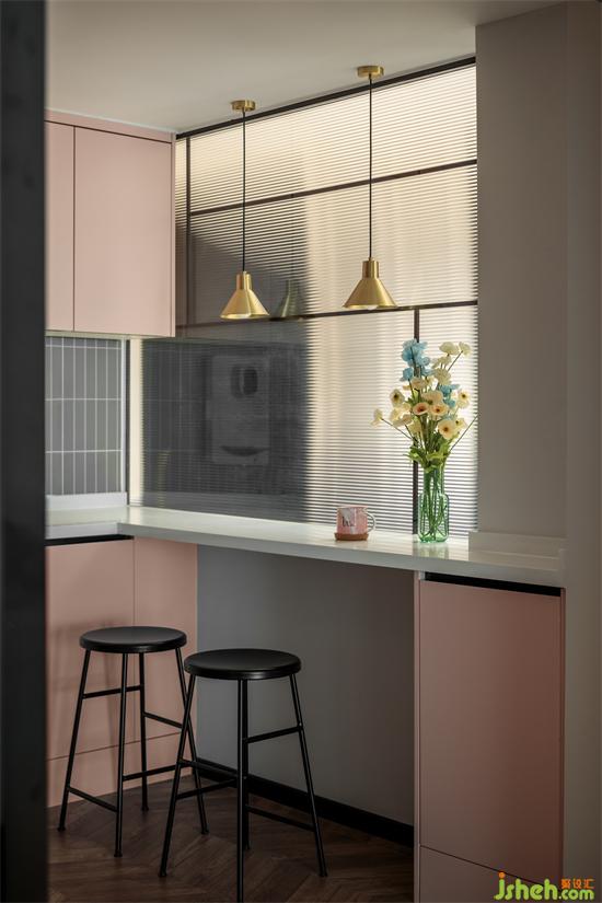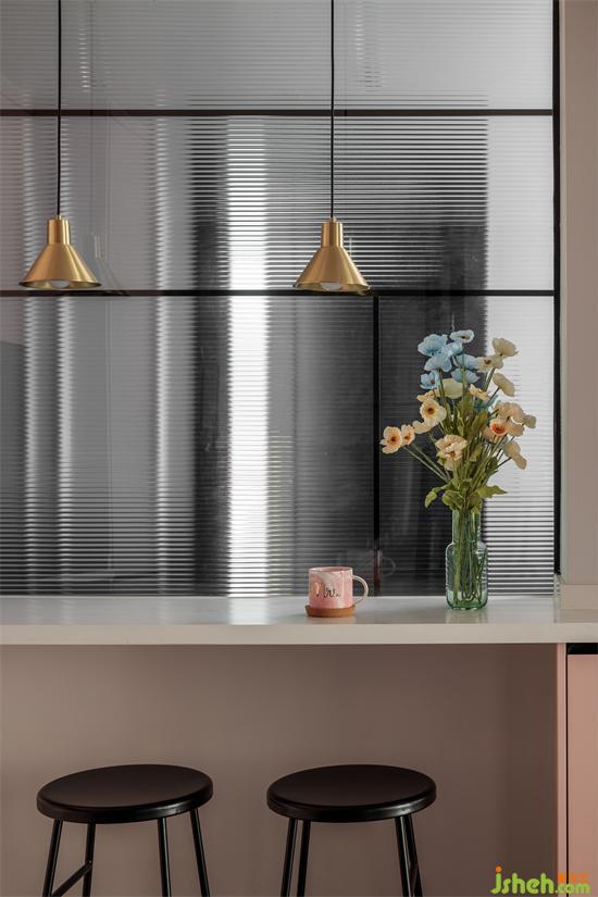 在吧臺位置設(shè)計(jì)了一個(gè)玻璃隔斷,家裝設(shè)計(jì)區(qū)分了區(qū)域空間,獨(dú)特美觀,又為空間引入了光。