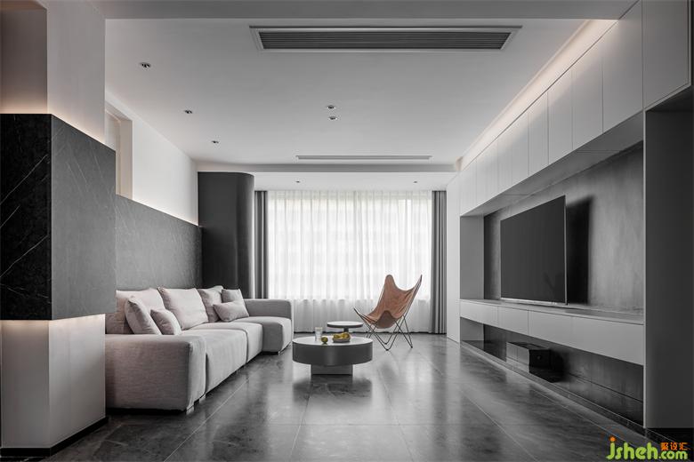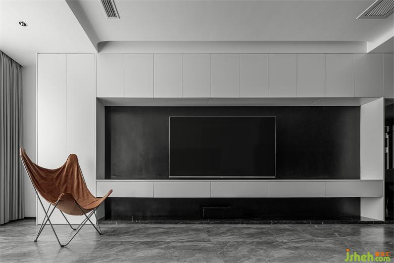 The TV wall is used as a cabinet to improve the storage. At the same time, the black-and-white gray tone is consistent, with wrong color blocks, and rich visual levels.