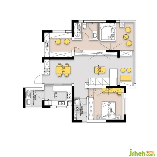 ②原有陽臺空間大,考慮到業(yè)主的生活習(xí)慣,將其一分為二,一部分依托于客廳,作為休閑的茶室,一部分用于擴充主臥的空間。