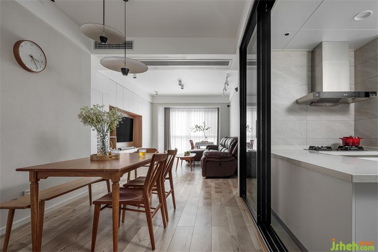 ①家裝設(shè)計打破廚房原有格局,利用移門打造多功能實用空間,實現(xiàn)了廚餐廳的聯(lián)動。