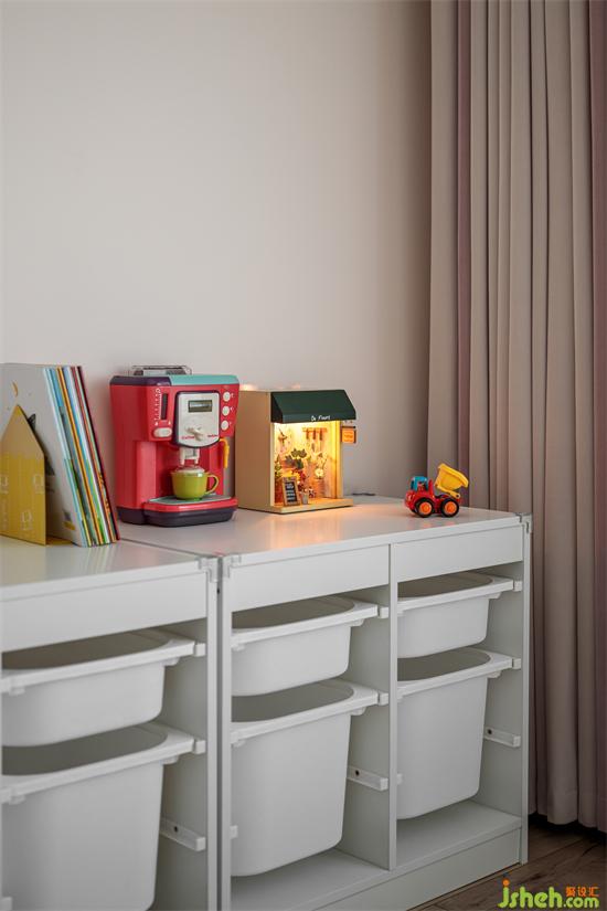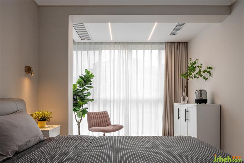 在主臥衣帽間的一角,設(shè)計了一張長書桌,可滿足兩人同時使用,把每一寸空間利用到極致,家裝設(shè)計增加了區(qū)域的功能性。